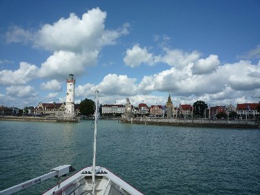 Bald grüßten uns die Vulkankegel des Hegau mit den seltsamen Namen Hohentwiel, Hohenhewen, Hohenkrähen und Mägdeberg. Auch einen ersten Blick auf den Bodensee bei Radolfzell konnte das aufmerksame Auge schon erhaschen. Vorbei an Überlingen, Uhldingen mit der Klosterkirche Birnau und Meersburg und erreichten wir – trotz zähflüssigen Verkehrs auf der B31 – keine Minute zu früh das moderne Friedrichshafen. Unser Bus setzte uns direkt am Hafen ab und wir bestiegen um 10:25 Uhr unser Kursschiff. Die Seereise führte uns über Langenargen, Kressbronn, Nonnenhorn, Wasserburg und Lindau (hier waren wir dann schon "mitten in Bayern"!) nach Bregenz. Nach ca. 2 Stunden "auf hoher See" betraten wir hier österreichischen Boden.
